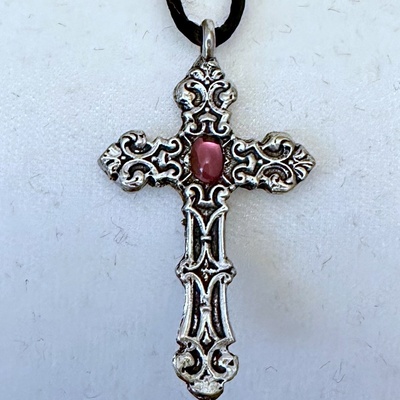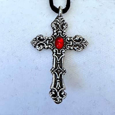 Large Gothic Silver Filigrees Cross with Ruby Red Stone Necklace