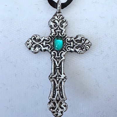 Large Gothic Silver Filigrees Cross with Emerald Green Stone Necklace